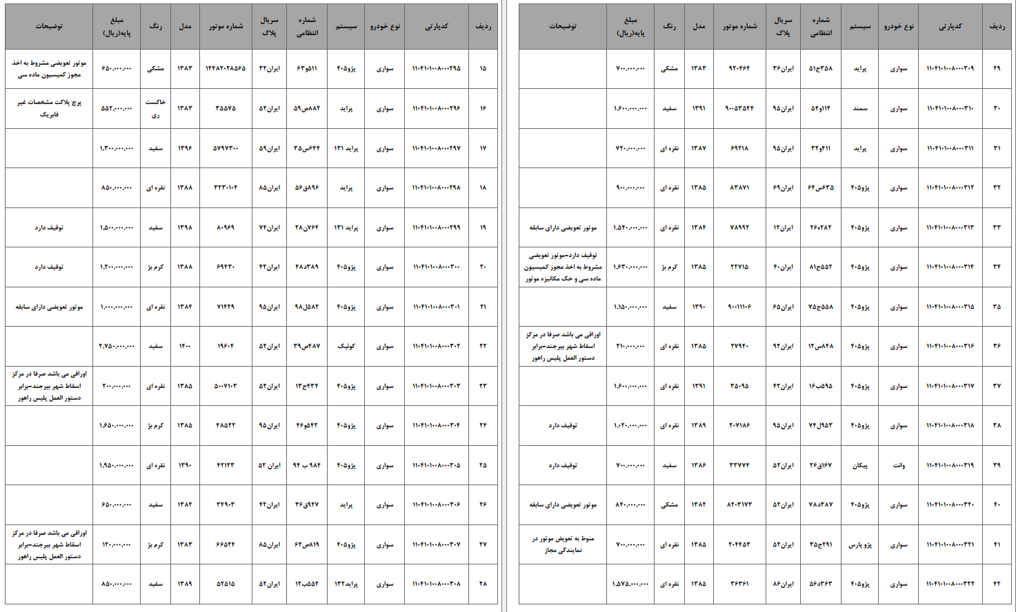 مزایده خودرو تعداد 111 دستگاه خودرو سبک، سنگین و موتورسیکلت در بیرجند به شرح زیر:
