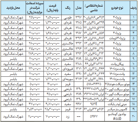 مزایده 20 دستگاه خودرو، ماشین آلات سنگین و موتورسیکلت به شرح زیر: