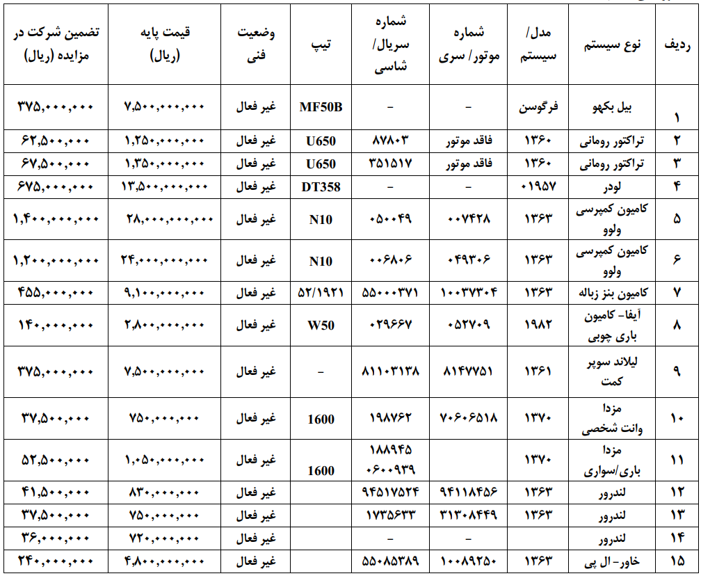 مزایده فروش تعداد 15 دستگاه خودرو سنگین و ماشین آلات:
