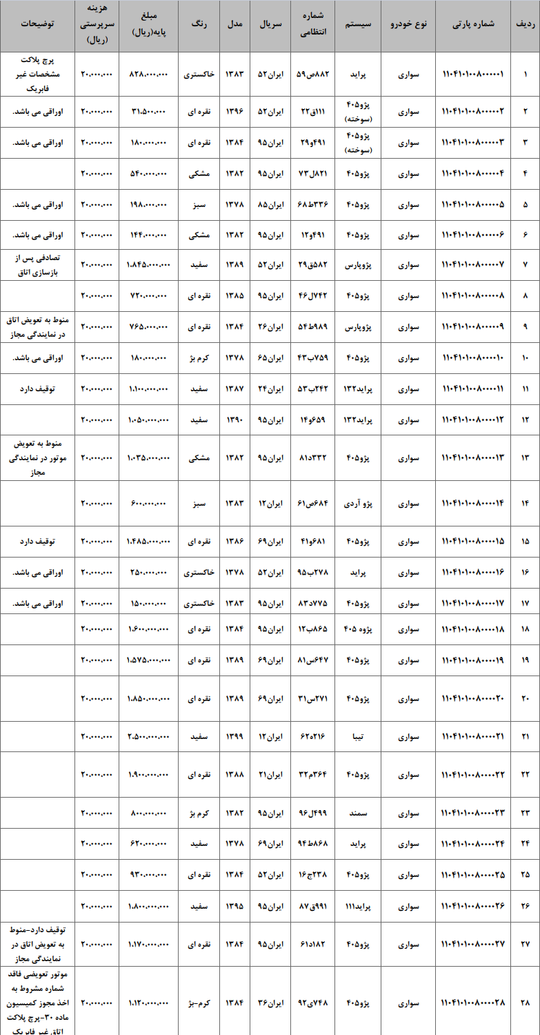مزایده 133 دستگاه خودرو (ام وی ام X33، پژو پارس، پژو 405، سمند، تیبا و ...)
