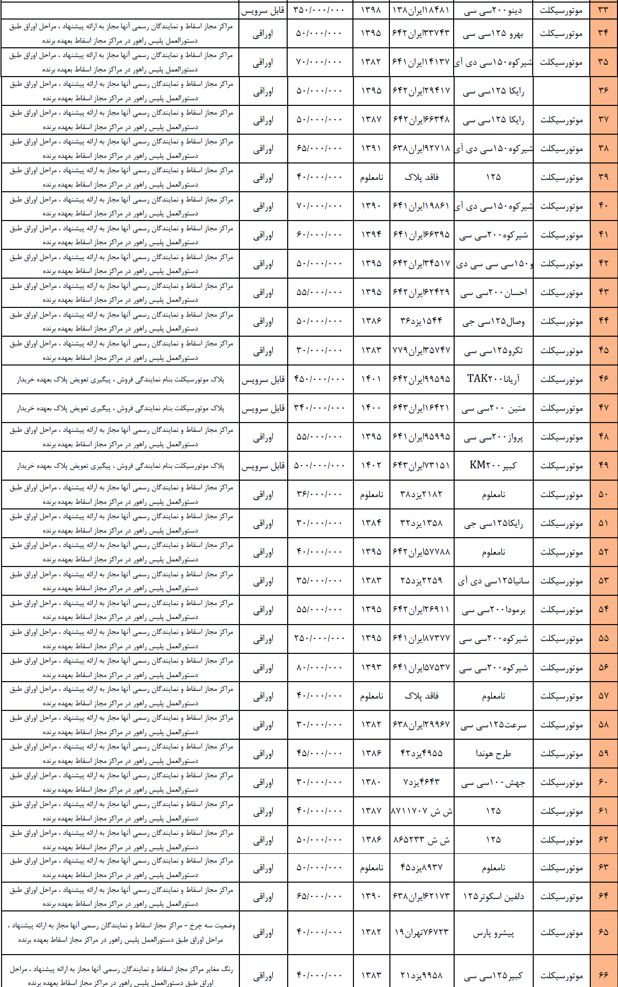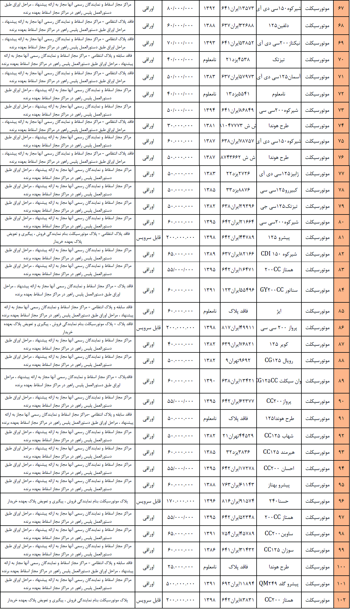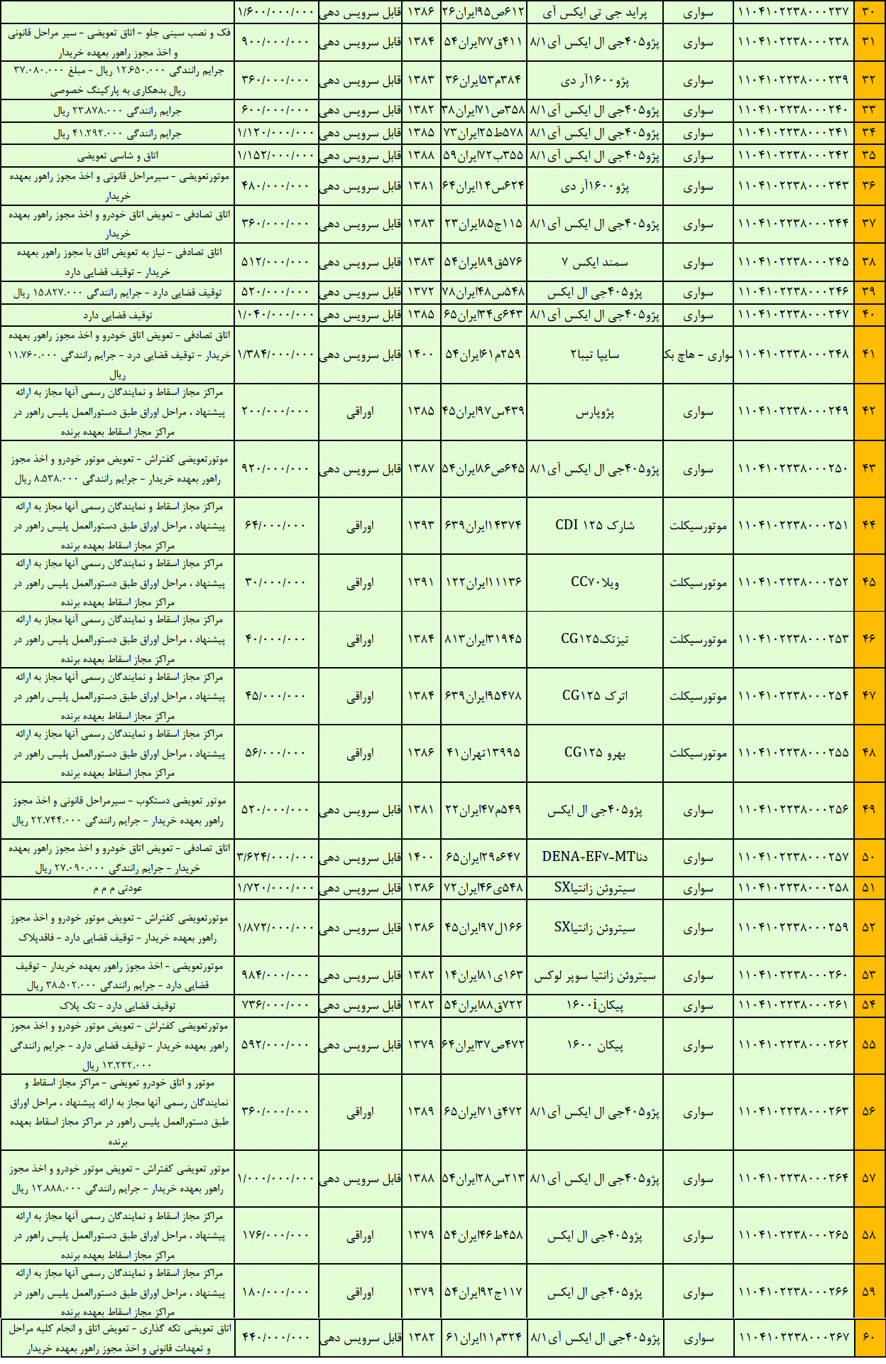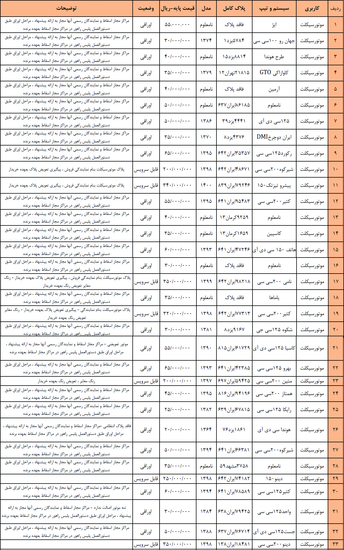 مزایده خودرو تعداد 160 دستگاه انواع خودرو سواری و موتورسیکلت به شرح زیر:
