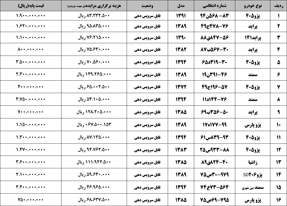 مزایده خودرو تعداد 16 دستگاه خودرو سواری به شرح زیر: